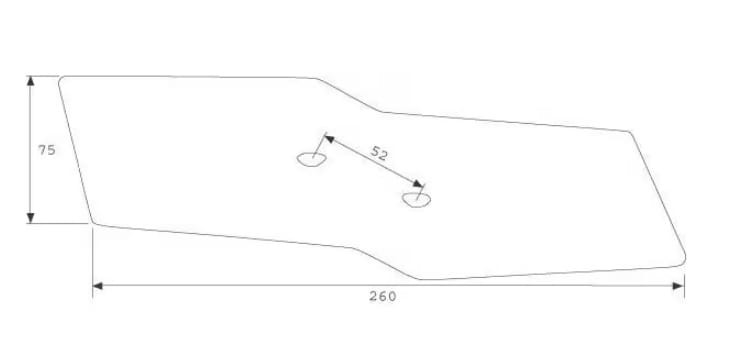 Wykonany z wytrzymałej stali, lemiesz prawy ma długość 260 mm, grubość 15 mm i szerokość 75 mm. Wyposażony w 2 otwory montażowe o średnicy 13 mm i rozstawie 52 mm, co gwarantuje szybki i pewny montaż.