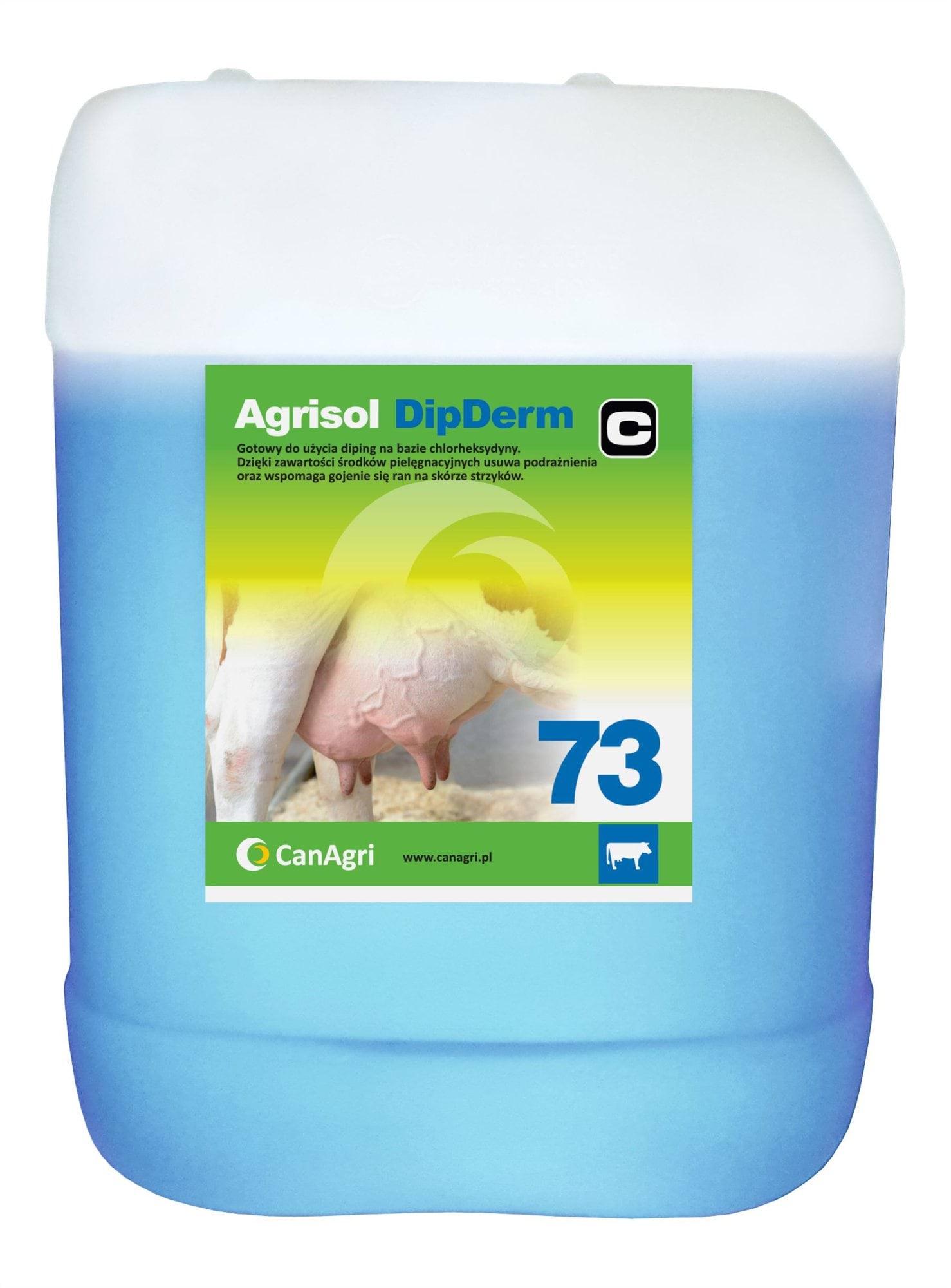 Przeznaczony jest do prewencji przeciwko mastitis oraz do utrzymania skóry strzyków w dobrej kondycji, eliminuje stany zapalne i zmiany skórne, wspomaga gojenie się ran na skórze strzyków długo utrzymuje się na skórze strzyku tworząc warstwę ochronną. Ze względu na obniżoną temperaturę krystalizowania się do -8 C Agrisol DipDerm jest przeznaczony również do stosowania w okresie zimowym.