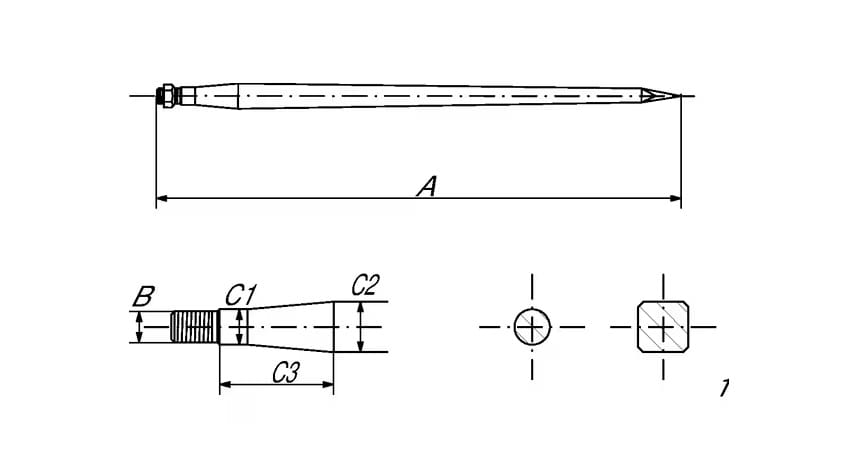 Ząb ładowacza, prosty, profil kwadratowy 44x1250 mm końcówka szpiczasta z nakrętką M28x1.5 czerwony gopart