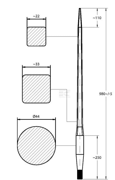 Ząb ładowacza, prosty, profil kwadratowy 44x980 mm końcówka szpiczasta z nakrętką M30x2 czerwony SHW