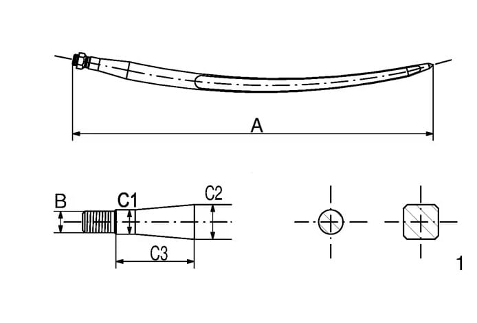 Ząb ładowacza, wygięty zamykający, profil kwadratowy 36x800 mm końcówka szpiczasta z nakrętką M22x1.5 czerwony SHW